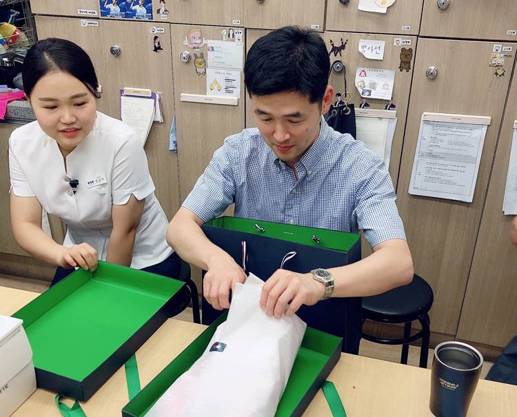 선물 공개 타임!! 핑크 폰 케이스를 애용하시는 원장님께는 핑크핑크한 티셔츠를 선물로 드렸어요 ㅎㅎ