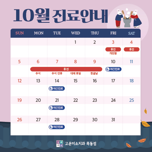 ![]() 안녕하세요. 연세고운미소치과 목동점입니다 :) 연세고운미소치과 목동점 10월 진료 일정 안내드립니다. 일정 참고하셔서 내원 및 예약 시 참고하시길 바랍니다. 고운미소치과는 2002년 1호점 '목동'을 시작으로 전국 14개 지점 규모로 성장한 네트워크 치과입니다. ·사람존중 ·열정과 지속 성장 ·책임감 |