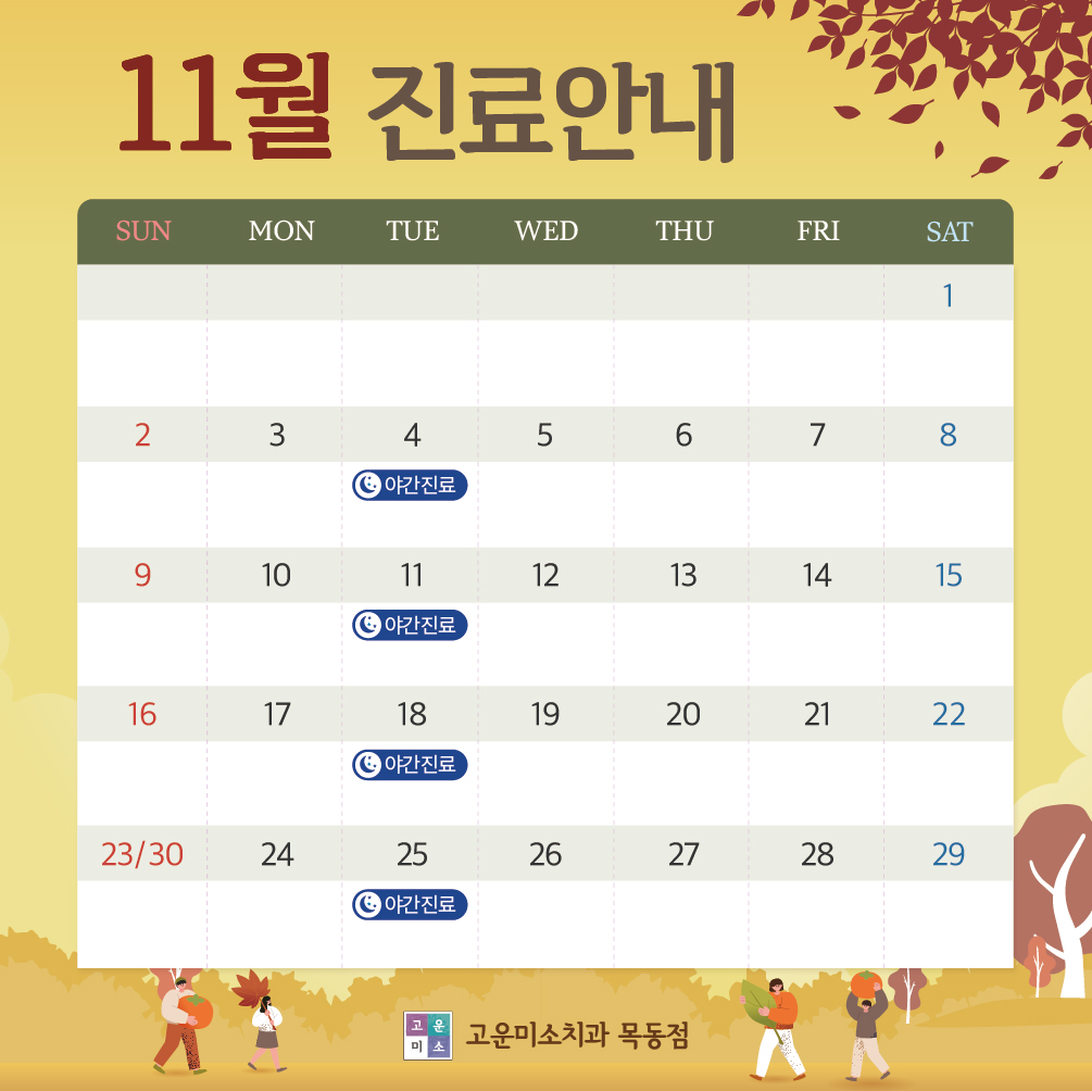 ![]() 안녕하세요. 연세고운미소치과 목동점입니다 :) 연세고운미소치과 목동점 11월 진료 일정 안내드립니다. 일정 참고하셔서 내원 및 예약 시 참고하시길 바랍니다. 고운미소치과는 2002년 1호점 '목동'을 시작으로 전국 14개 지점 규모로 성장한 네트워크 치과입니다. ·사람존중 ·열정과 지속 성장 ·책임감 |