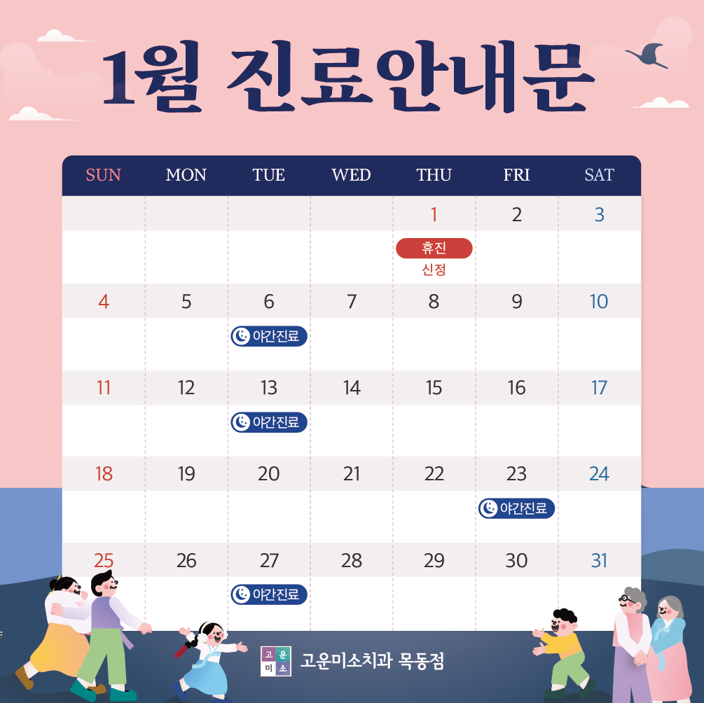 ![]() 안녕하세요. 연세고운미소치과 목동점입니다 :) 연세고운미소치과 목동점 1월 진료 일정 안내드립니다. 일정 참고하셔서 내원 및 예약 시 참고하시길 바랍니다. 고운미소치과는 2002년 1호점 '목동'을 시작으로 전국 14개 지점 규모로 성장한 네트워크 치과입니다. ·사람존중 ·열정과 지속 성장 ·책임감 |