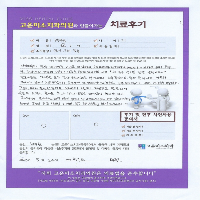 배열도 고르게 변하고 자연스럽게 웃을 때도 입을 안 가리게 된 것 같아 만족스럽습니다.
