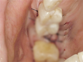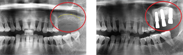아래턱 어금니 발치 후 장시간 방치하여 잇몸 뼈 소실이 심한 상태로 내원. 뼈 이식 후 임프란트를 식립하였습니다.