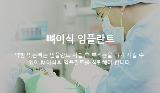 치아가 빠진 후 장시간 방치하면 뼈의 흡수가 진행되어 잇몸 뼈가 약해지게 됩니다. 약해진 잇몸 뼈는 임플란트 식립이 어려워 부족한 뼈를 보강한 후 임플란트 시술을 해야 합니다.