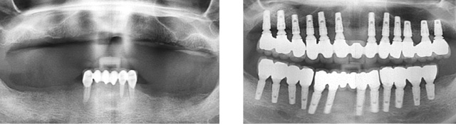 치아상실 상태가 오래 되어 적절한 영양섭취가 힘들어 “영양부족”으로 내원한 환자분. 우선 영양섭취를 위하여 음식물을 씹을 수 있는 임시치아를 빠르게 만들어 드렸습니다. 건강상태가 회복되어 상악은 12개의 임플란트를 식립 하고, 하악의 경우 잇몸 뼈가 많이 소실되어 2개의 임플란트를 식립하고 임플란트 틀니를 장착하였습니다.