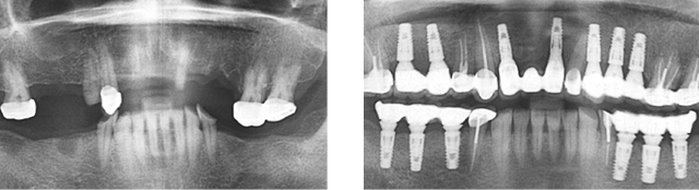오래된 브릿지가 떨어지고 치아 결손이 심한 상태로 내원한 고혈압 환자분. 혈압이 정상 수치보다 높아 내과와 연계하여 혈압을 90~140 사이로 조절하여 총 13개의 임플란트를 식립 하였습니다.