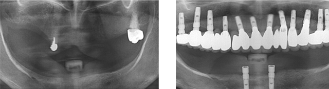 임플란트를 지지하기 위한 뼈의 상태가 좋지 않아, 상악동 뼈 이식과 함께 총 24개의 임플란트를 식립하였습니다. 전체 임플란트가 완성된 이후에도 내과와 지속적인 연계로 전신건강이 회복될 수 있게 노력해야 합니다.