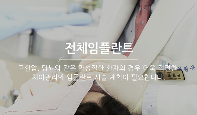 전체 임플란트를 식립하는 분들 다수는 고령자입니다. 그래서 고운미소치과는 고혈압과 당뇨와 같은 만성질환 환자의 경우 환자 개개인의 건강과 치아 상태를 고려한 안정적인 임플란트 시술을 진행하고 있습니다.