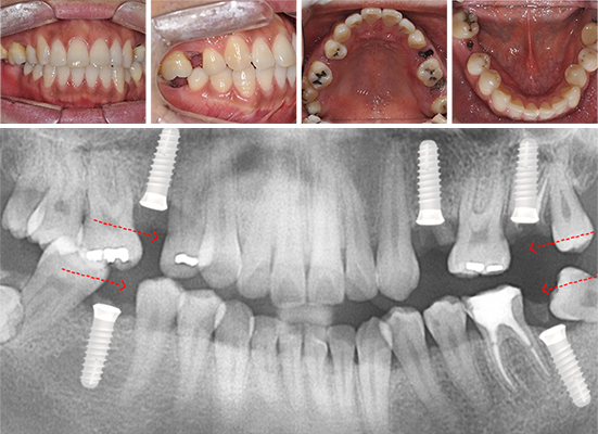 30대 남환으로 다른 치과에서 임플란트 5개 진단을 받고 내원. 교정과 협진으로 공간을 메꾸고 오른쪽 위 치아에 임플란트를 1개만 식립하여 자연치아를 최대한 활용하는 진료 계획을 세움.