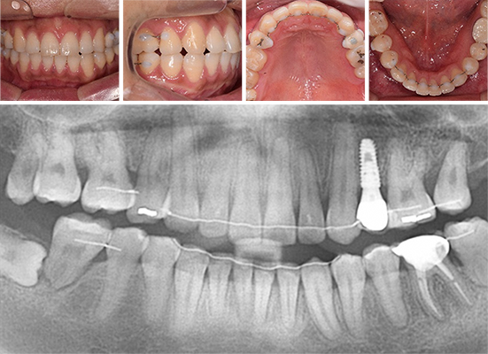 치아 배열이 가지런하게 되었고 제거된 임플란트 공간은 앞니의 후방이동과 어금니들의 전방이동으로 잘 폐쇄되어 본인의 치아를 최대한 보존하며 교정적으로도 만족할 수 있는 결과를 획득하여 유지하고 있습니다.