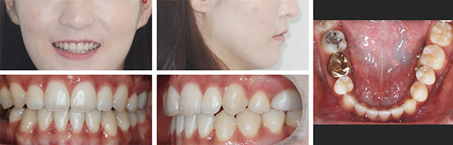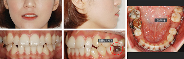 이가 고르지 않고 입술이 나와 보여 개선되기를 원하심. 일반적인 교정치료 방법인 위/아래 작은 어금니 발치 후 앞니 견인을 계획하였으며, 좌측 아래쪽에는 상실된 어금니를 대체하고 있던 임플란트의 뿌리와 지대주 부분만 남아있어 가급적 자연치 보존을 위해 작은 어금니 대신 임플란트를 제거하고 사랑니를 포함한 어금니를 전방으로 당겨오는 치료 진행.