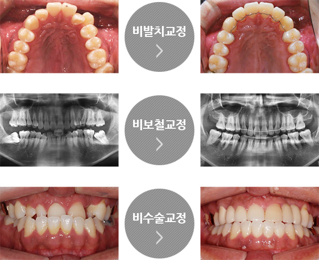 한번 상실된 자연 치아는 되돌릴 수 없습니다. 그렇기에 더욱 신중하고 정확한 진단과 치료 계획 수립이 이루어져야 합니다. 고운미소치과 목동점은 중등도 이하의 골격 부조화로 인한 불규칙한 치열과 부정교합 증상을 가지고 계신 환자 분의 자연 치아를 최대한 유지하고, 부담스러운 양악수술 대신 정상교합을 찾을 수 있는 비발치/ 비보철/ 비수술 원칙을 통해 교정 치료를 진행합니다.