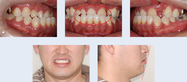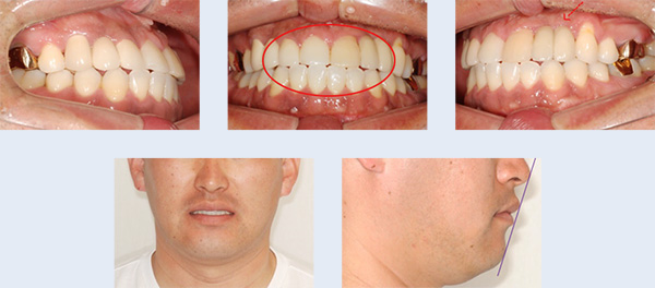 아랫니가 앞니보다 바깥쪽으로 위치한 증상을 바로잡고 빠진 윗니를 수복하기 위해 내원한 37세 남성입니다. 검사 결과 위쪽 영구치 3개 결손 된 상태였으며, 아래턱이 전방 위치된 주걱턱(골격성 3급 부정교합)으로 진단 하였으나 양악수술 없이 치료를 원하셔서 치아교정과 임플란트 치료를 병행하였습니다.