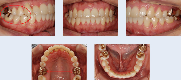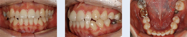 약 2년 간의 교정 치료 후 정상적인 앞니 배열과 임플란트 식립에 필요한 공간이 확보되어 보철 치료를 한 후 교정 장치를 제거하였습니다. 거꾸로 물려 정상적인 기능이 어려웠던 앞니의 심미적, 기능적 회복이 동시에 이루어졌습니다.