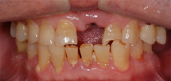 치아의 마모와 파절 때문에 내원한 50대 남성 환자. 오랜 세월 마모된 앞니로 인하여 미관상으로나 치아건강 상의 회복이 필요한 환자분 입니다. 고운미소에서는 치아건강과 심미적 개선을 위하여 앞니 보철치료와 함께 움푹 패인 부위는 레진으로 메우기로 하였습니다.