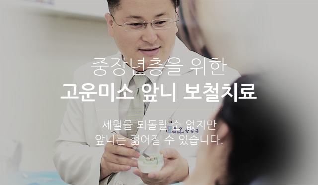 앞니가 보이는 정도, 치아의 마모, 색상 등도 나이 들어 보이게 만드는 요소가 되는 것입니다. 중 장년층 보철치료를 통하여 가지런한 앞니는 심미적 개선뿐만 아니라 잇몸 건강 개선에도 도움이 됩니다.