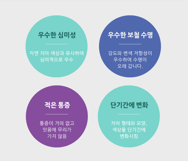 치아 위치 이상이나 색의 부조화 정도가 심한 치아, 심한 충치로 인해 신경치료를 한 치아, 외상으로 인해 보철수복이 필요한 치아의 경우 선택하는 치료로, 기존의 불량 보철물이나 금속 도재관으로 치료 받은 앞니의 경우 잇몸과 보철물 경계부위에 검게 보이는 현상이 종종 발생하는데 이런 부분을 재치료 할 때 자연치아와 유사한 결과를 얻을 수 있습니다.
