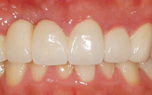 기존 불량 보철물 이상으로 내원한 40대 남성환자. 고운미소에서는 오염된 불량 보철물을 제거하고 기존의 PFM 보철물에 비하여 자연스러운 색조를 재현할 수 있고, 시간이 지나도 잇몸이 검게 변하는 현상이 거의 없는 올세라믹으로 치아를 수복하였습니다.
