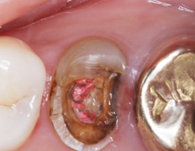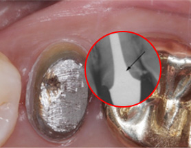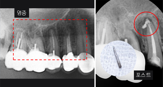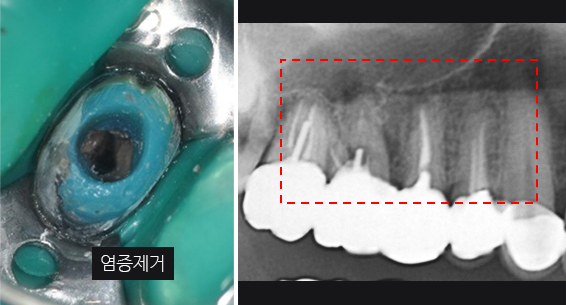 잇몸 염증으로 내원, 기존 보철물 수복시 신경관을 제대로 치료하지 못하여 염증이 재발된 상황이었습니다. 고운미소에서는 기존 포스트를 제거하고 오염된 부위에 약재를 삽입하여 염증을 제거하는 신경치료를 시행하였습니다.