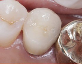 염증을 제거하는 신경치료 후 치근단 부위가 빠르게 회복되어 깔끔하게 신경치료를 완료하고 크라운 보철물을 씌웠습니다. 신경치료를 받은 치아는 약해져 있기 때문에 크라운 보철물로 씌워주어 세균 감염을 예방해야 합니다.