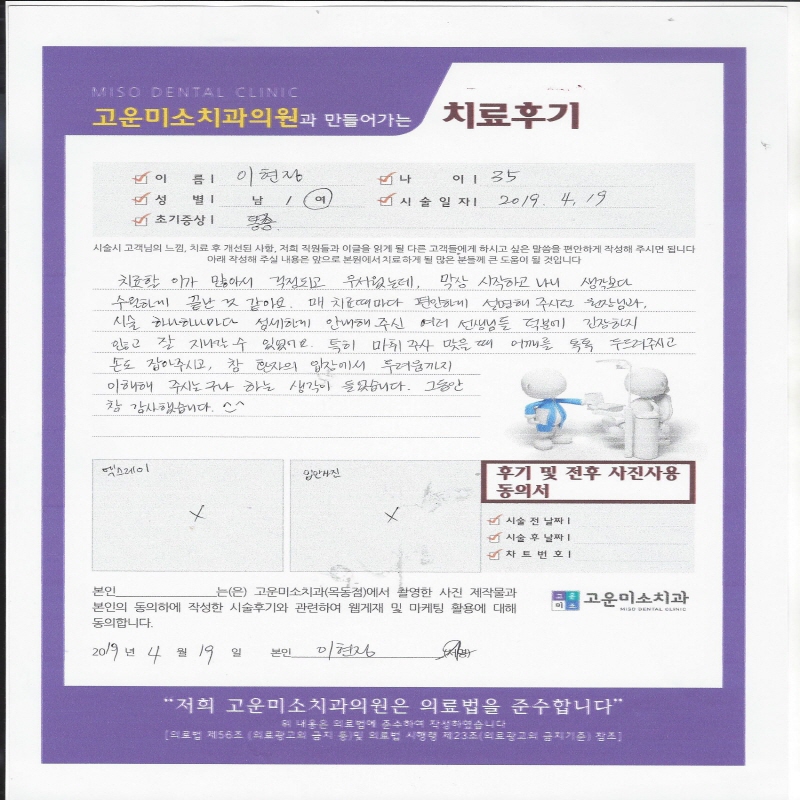고운미소치과에서 진료를 받으면서 마음이 조금씩 놓이기 시작했습니다.
