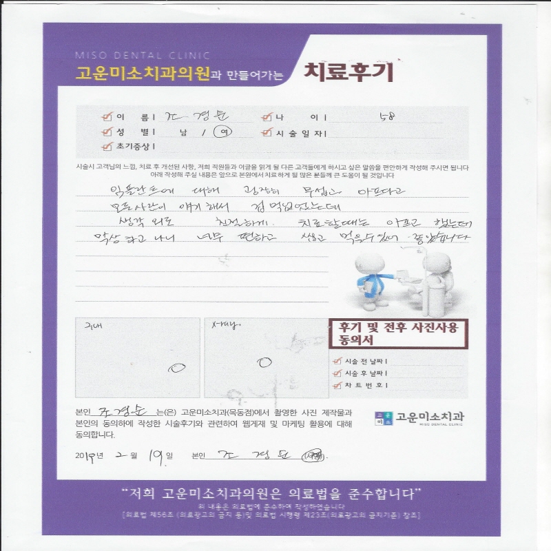 치과라고 하면 누구나 무서움을 제일 먼저 느끼게 됩니다.임플란트는 충치치료보다 익숙치 않아 더 긴장되었던 것 같습니다.그래도 원장님의 상세한 설명덕에 고운미소치과의원을 선택하게 되었고시술이 끝난 오늘 그날의 선택이 옳았다고 생각합니다.시술 전 과정동안 통증이나 붓기도 크지 않았기에일상생활에도 지장이 없었고 회복도 굉장이 빨랐습니다.제 가족이 다닐 치과를 고르게 된 것 같아서마음이 든든합니다. 다시 한번 원장님외 간호사분들께감사드립니다