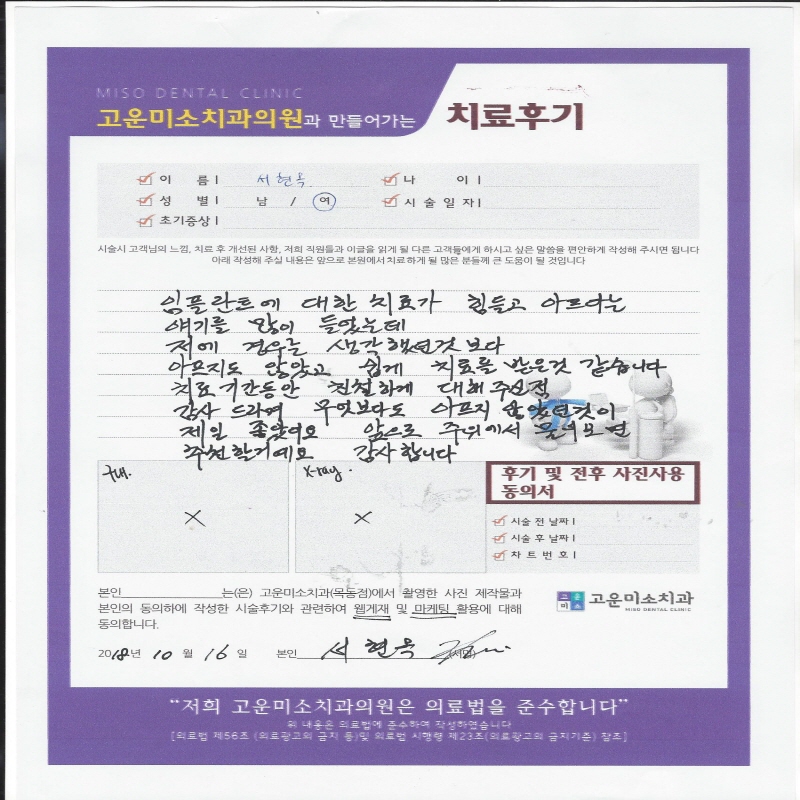 임플란트에 대한 치료가 힘들고 아프다는 얘기를 많이 들었는데저에 경우는 생각했던것 보다아프지도 않았고 쉽게 치료를 받은 것 같습니다.치료기간동안 친절하게 대해 주신 점감사드리며 무엇보다도 아프지 않았던것이제일 좋았어요. 앞으로 주위에서 물어보면추천할거예요. 감사합니다.