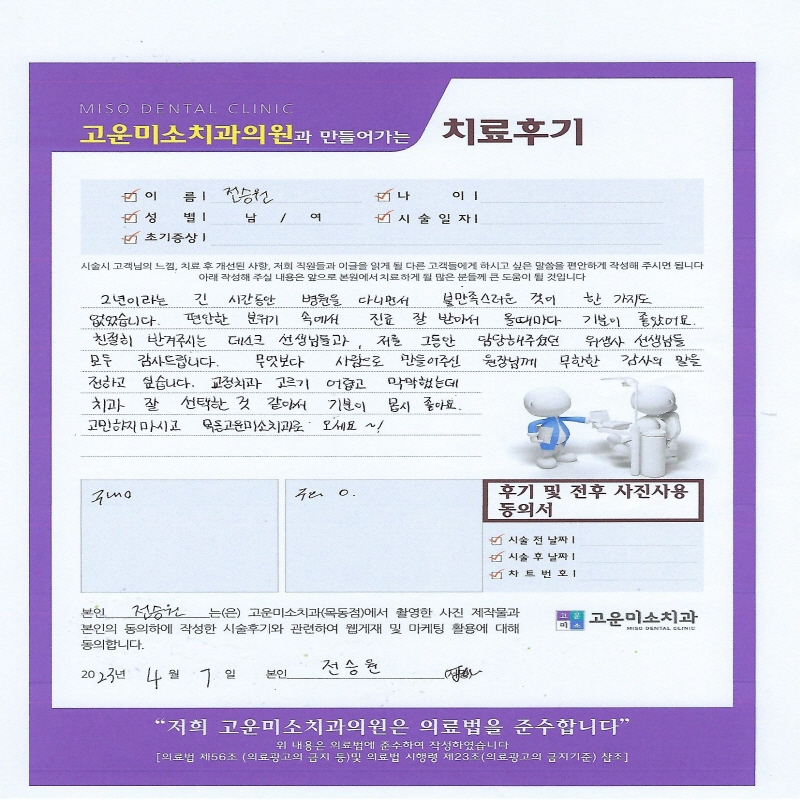 2년이라는 긴 시간동안 병원을 다니면서 불만족스러운 것이 한 가지도없었습니다. 편안한 분위기 속에서 진료 잘 받아서 올때마다 기분이 좋았어요.친절히 반겨주시는 데스크 선생님들과, 저를 그동안 담당해주셨던 위생사 선생님들모두 감사드립니다. 무엇보다 사람으로 만들어주신 원장님께 무한한 감사의 말을전하고 싶습니다. 교정치과 고르기 어렵고 막막했는데치과 잘 선택한 것 같아서 기분이 몹시 좋아요.고민하지 마시고 목동고운미소치과로 오세요~!