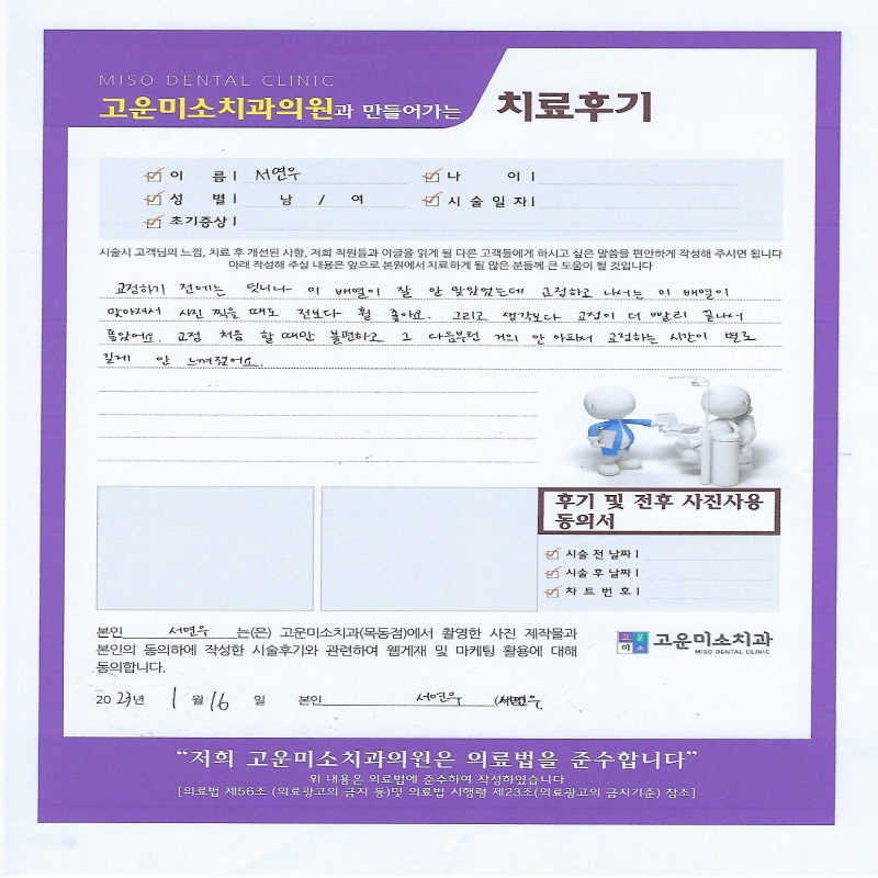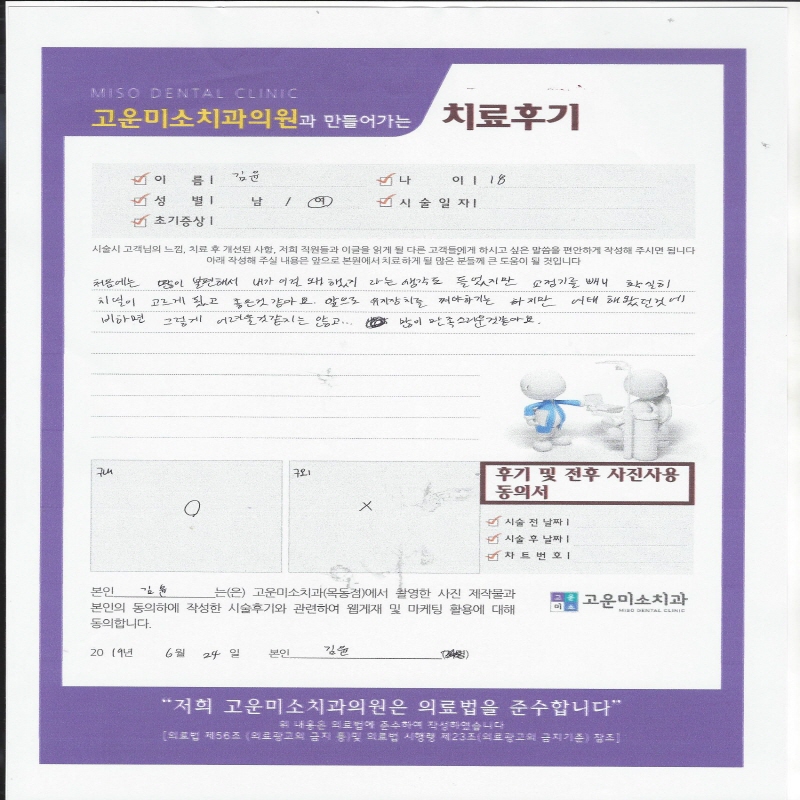 어렸을때부터 치아교정을 계속 고민하다가 남들보다 조금 늦게 시작하게 되었습니다.여러군데 다니면서 상담받았는데 고운미소치과의원이 가장 믿음직스럽다고 느껴져서 선택했고결과도 아주 만족스럽습니다. 가격과 치료기간, 선생님들도 모두 친절하게 맞아 주시고진료해주셨어요! 덕분에 환하게 웃을 수 있게 되었습니다. 감사합니다.