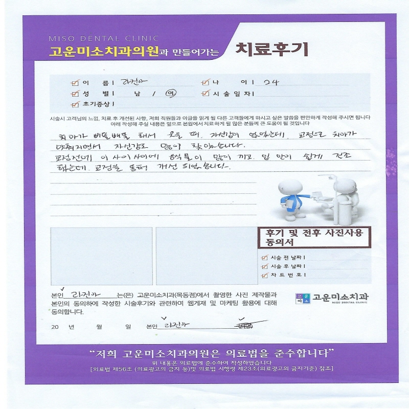 치아가 삐뚤빼뚤해서 웃을 때 자신감이 없었는데 교정으로 치아가맞춰지면서 자신감도 많이 찾았습니다.교정전에 이 사이사이에 음식물이 많이 끼고 입 안이 쉽게 건조했는데 교정을 통해 개선 되었습니다.