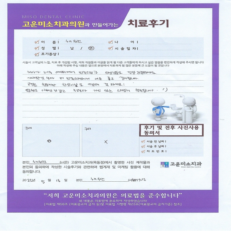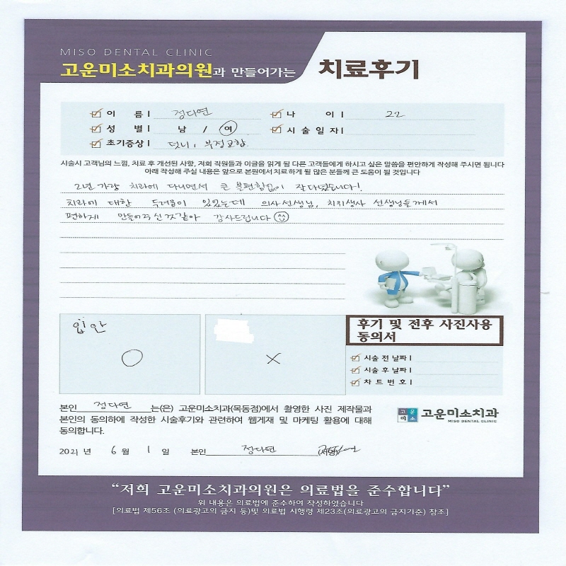 사실, 치과를 두려워하고 겁나서 다니기 어렵다고 생각했는데고운미소치과의원은 선생님들과 간호사 선생님들 모두 친절하시고 항상 따뜻하게 대해주셔서두려운 마음은 접고 끝까지 다닐 수 있었습니다. 항상 감사합니다. 앞으로도 정기검진 열심히 받고 다닐게요.