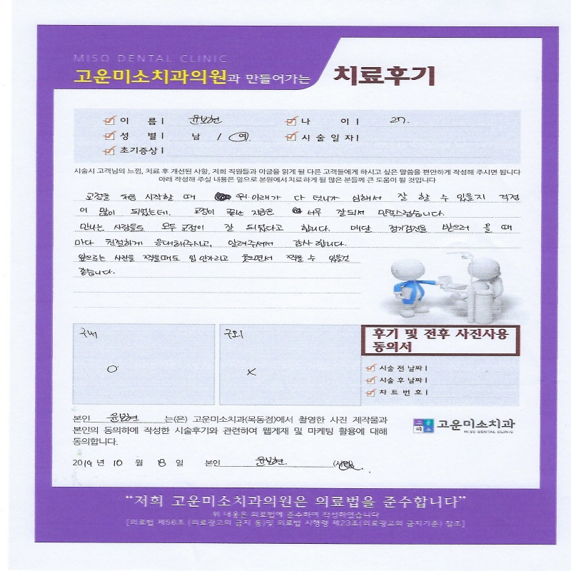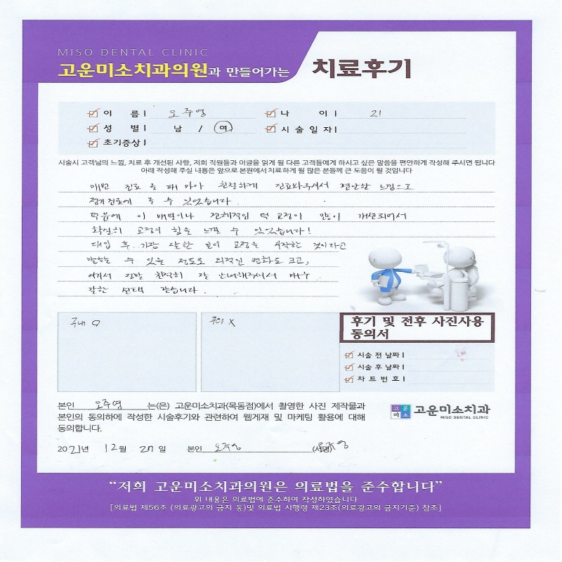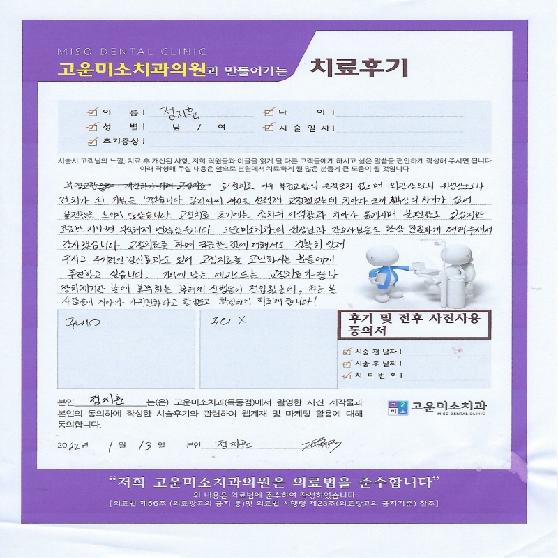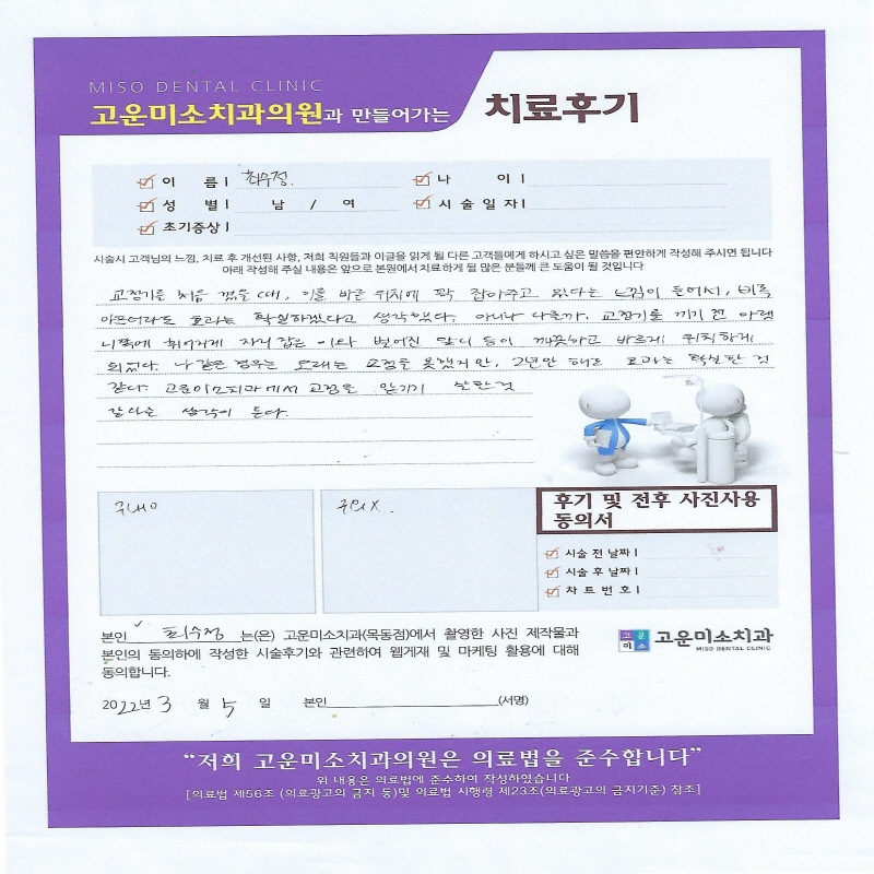 교정치료 이후 부정교합의 흔적조차 없으며 외관상으로나 위생상으로나건치가 된 기분을 느꼈습니다. 클리피씨 재질을 선택해 교정했었는데 치아와 크게 색상의 차이가 없어불편함을 느끼지 않았습니다. 교정치료 초기에는 장치의 어색함과 치아가 옮겨지며 불편함도 있었지만조금만 지나면 익숙해져 괜찮았습니다. 고운미소치과의 원장님과 간호사님들도 항상 친절하게 대해주셔서감사했습니다. 교정치료를하며 구금한 점에 대해서도 정확히 알려주시고주기적인 검진효과도 있어 교정치료를 고민하시는 분들에게추천하고…
