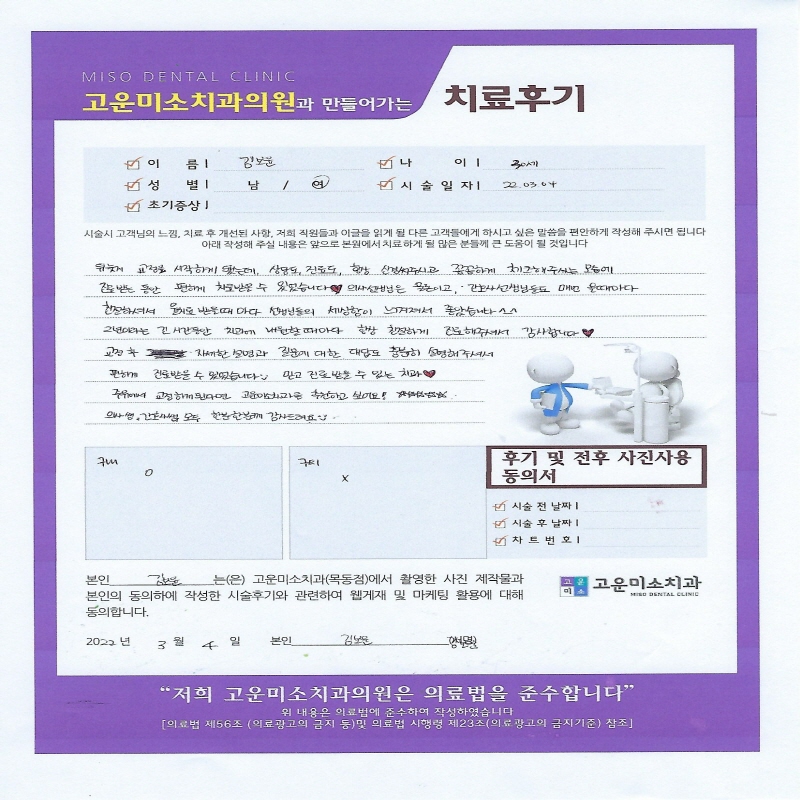 임플란트 식립했는데 이번 식립은 아주 만족합니다.선생님의 의술이 신뢰를 더했고 믿음을 주는 말씀에 더 안심했습니다.우선, 치과 간호사(치기공사?)님의 정성담긴 간호에 감명받았습니다.아픈이를 치료할때 두드려주셔서 덜 아팠습니다.의사선생님의 전, 후 상세한 설명에도 다른 치과와 다른 친절과 전문가의 의료상식을 알게되었습니다.고운미소치과. 정말 추천하고 싶어요.