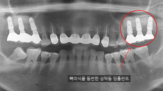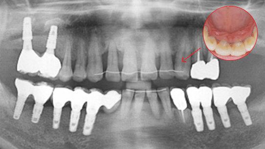 심한 염증과 기존 보철물의 오염상태가 심해 다른 병원에서 임플란트 17개 진단을 받고 내원, 특히 앞니부분의 치조골이 많이 약해져 흔들림이 심하여 바로