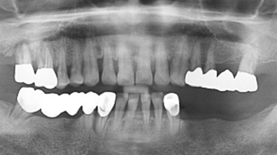 오염된 보철물을 제거하고 임플란트 11개를 식립하였습니다.