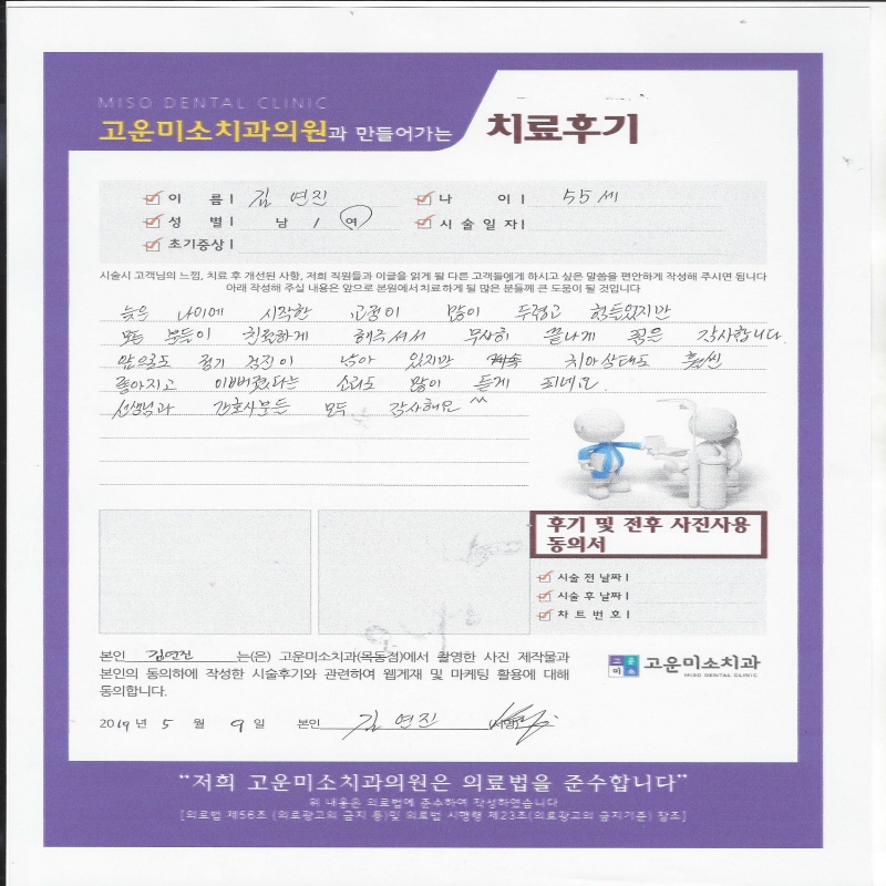 타 치과 에서 6개 치아를 발치하고 12개 임플란트 식립을 진단받고 내원. 고운미소에서 치주치료를 통하여