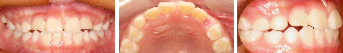 위턱의 성장이 부족하고 아래턱 성장이 과도하여 치아가 반대로 물리는 초등학생 환자입니다. 이 상태가 지속되면 성장이 끝나도 앞니가
