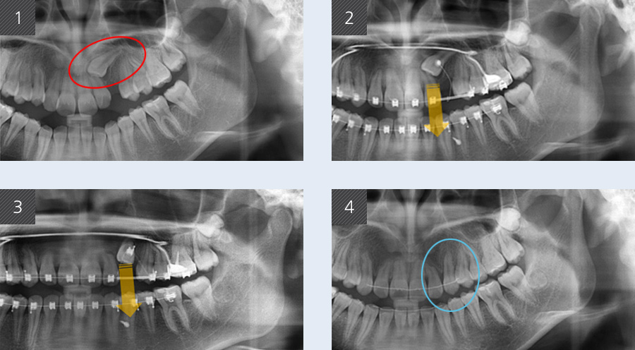 자연치아를 유지할 수 있도록 간단한 수술을 통해 매복 치아에 치아교정 장치 부착하고 아래 쪽에는 교정용
