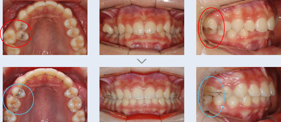 비대칭 모양의 치열을 대칭 형태로 개선하였고 송곳니와 작은 어금니의 위치를 정상적으로 되돌렸습니다. 또한