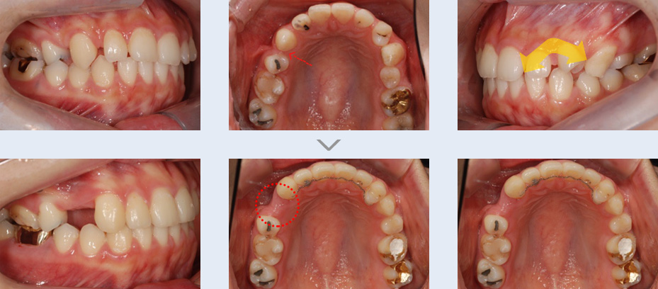 본래 송곳니가 있어야 할 자리로 매복된 송곳니를 이동시켰습니다. 그 결과 고르지 않았던 앞니가 가지런해졌으며