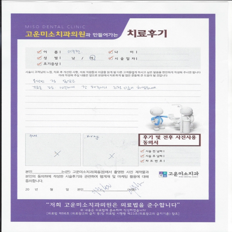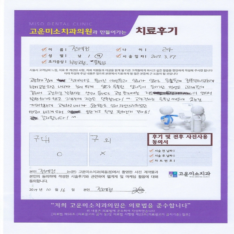 적어도 1년에 한번씩은 방사선 사진 촬영을 포함한 검사를 진행하여 상담 후 적절한 시기에 교정 치료를 진행해 주시는 것이 바람직합니다.