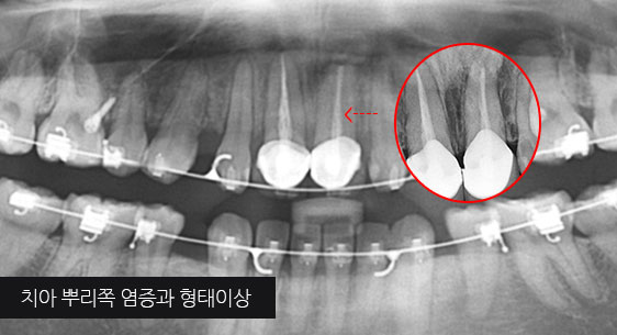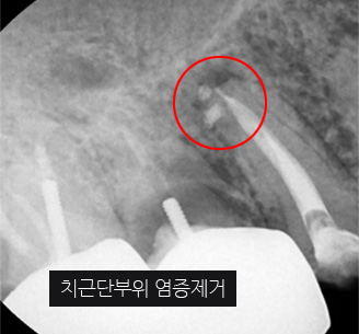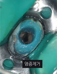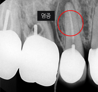 기존 신경치료는 양호한 상태이나 치근부위에 염증과 치조골 소실이 진행 중